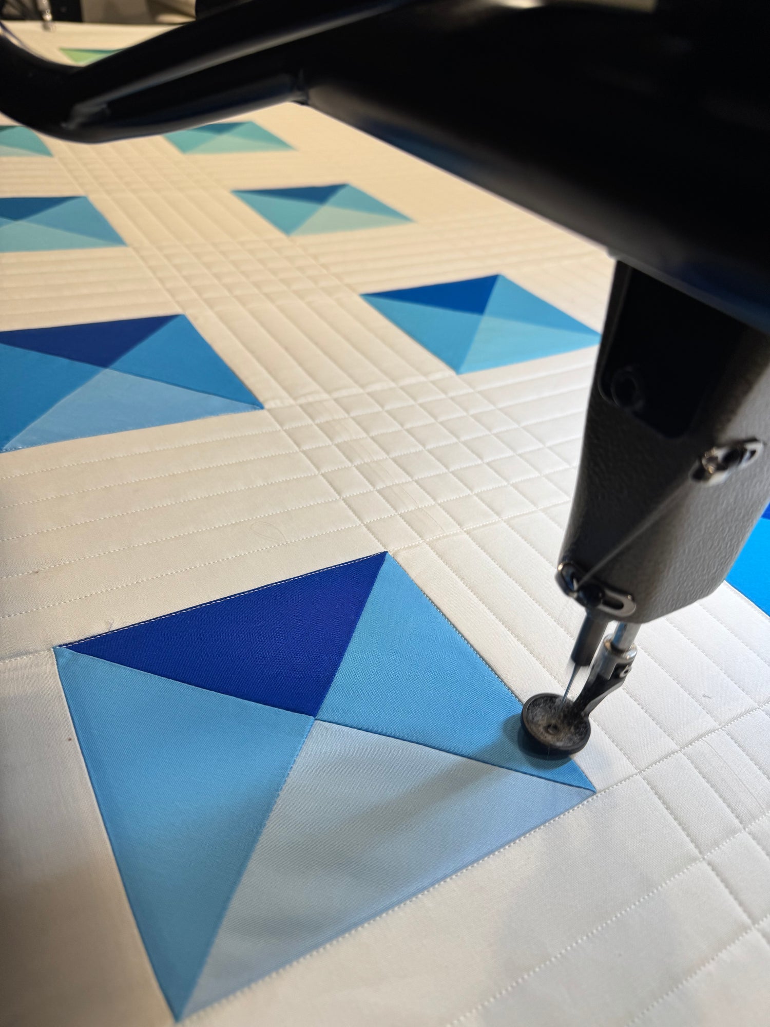 Custom quilting features unique designs for each quilt, with specific patterns for every block and border. We can create the perfect quilting design from scratch, made to suit your style and piecework. We will digitally draw over your quilt top to create a one-of-a-kind design, and then the machine will perfectly execute the stitching. This intricate process demands more skill and time, affecting the price, which varies based on design complexity, quilting density, and customer requirements.